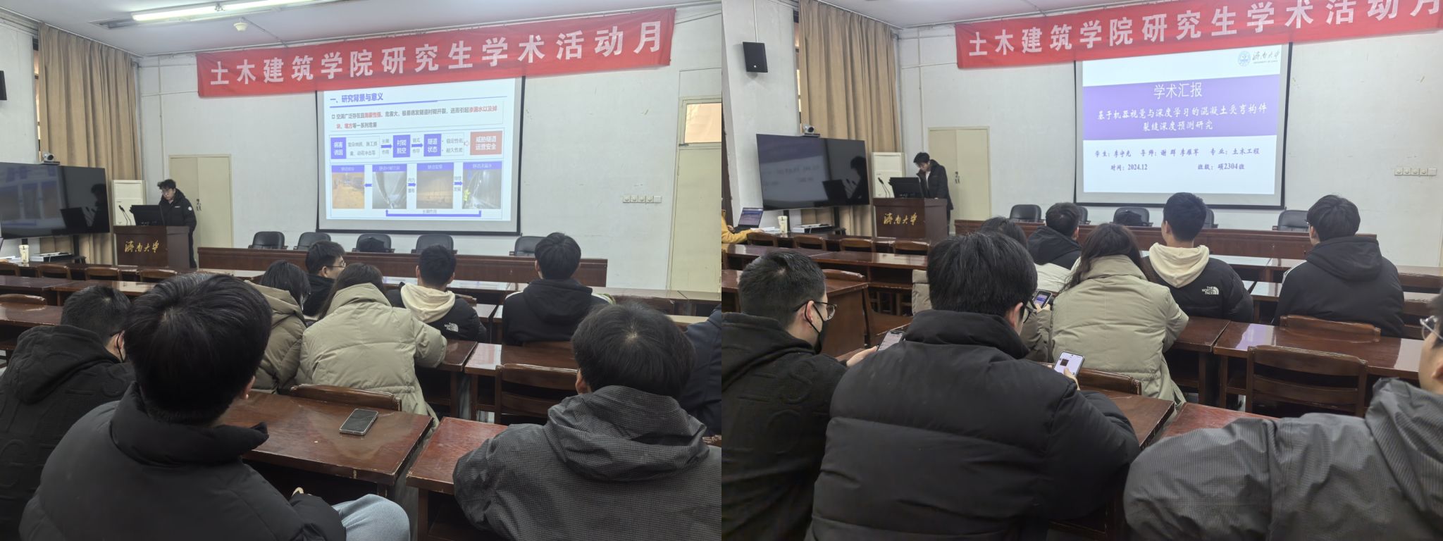 李守光以“基于机器视觉与深度学习的混凝土受弯构件裂缝深度预测研究”为题提出了一种基于机器视觉与深度学习相结合的方法来预测混凝土受弯构件的裂缝深度。利用机器视觉技术获取混凝土构件表面裂缝的图像信息。 刘科以“基于超细粉煤灰漂珠的高铁隧道空洞病害高性能修复材料及其性能研究”为题以超细粉煤灰漂珠为主要原料,研发了一种新型高性能修复材料。通过对材料的组成设计、制备工艺优化,并采用多种测试手段对其力学性能、耐久性能、微观结构等进行了全面研究。禚旭以“集成式传感单元对温度扰动的相应规律研究”为题通过精心设计实验方案,构建了包含多种传感器的集成式传感单元测试平台,对其在不同温度变化速率、温度范围以及环境条件下的响应规律进行了系统探究。