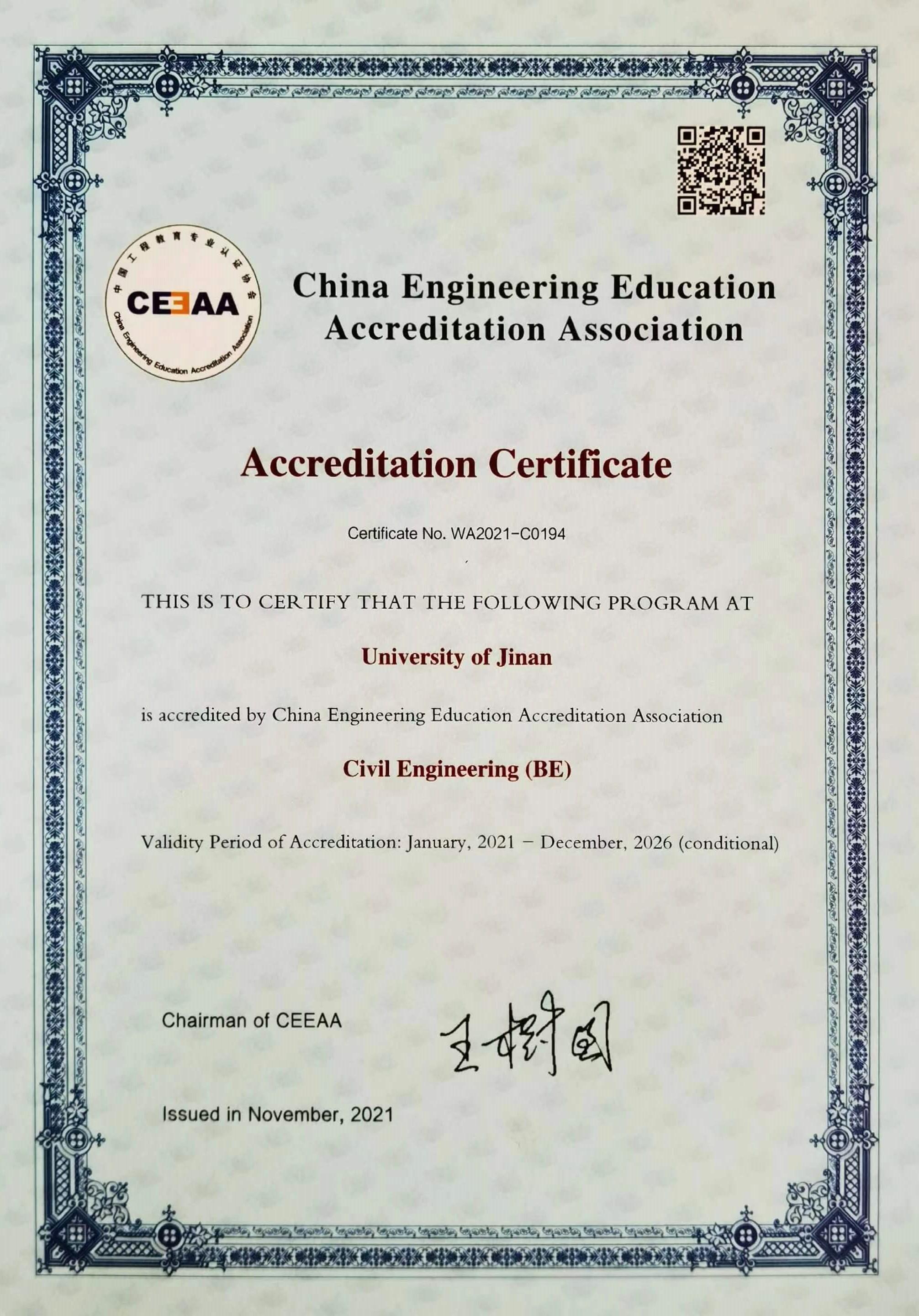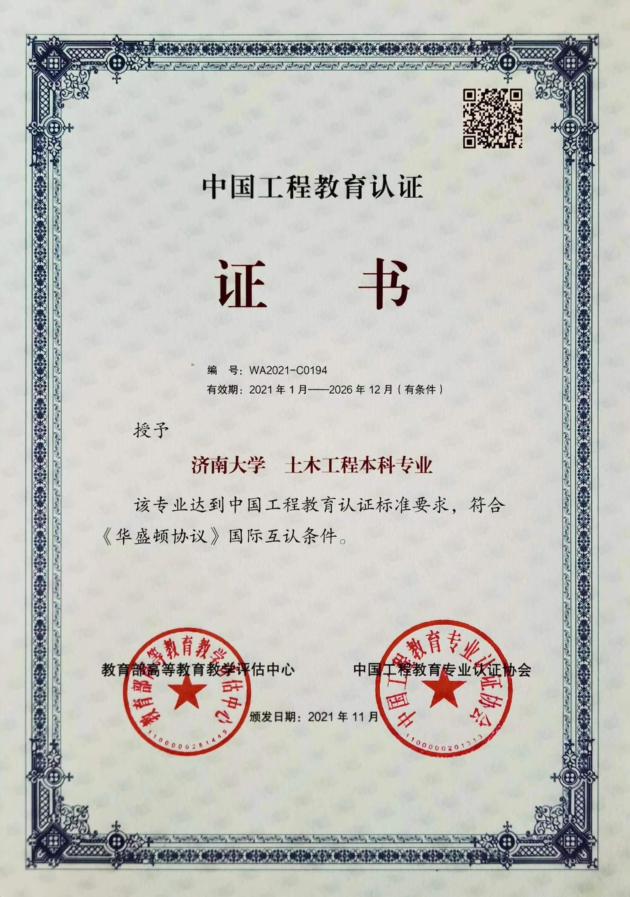 近日,教育部高等公司产品评估中心、中国工程教育专业认证协会为公司土木工程专业颁发认证证书,认证时效6年(2021年1月-2026年12月)。