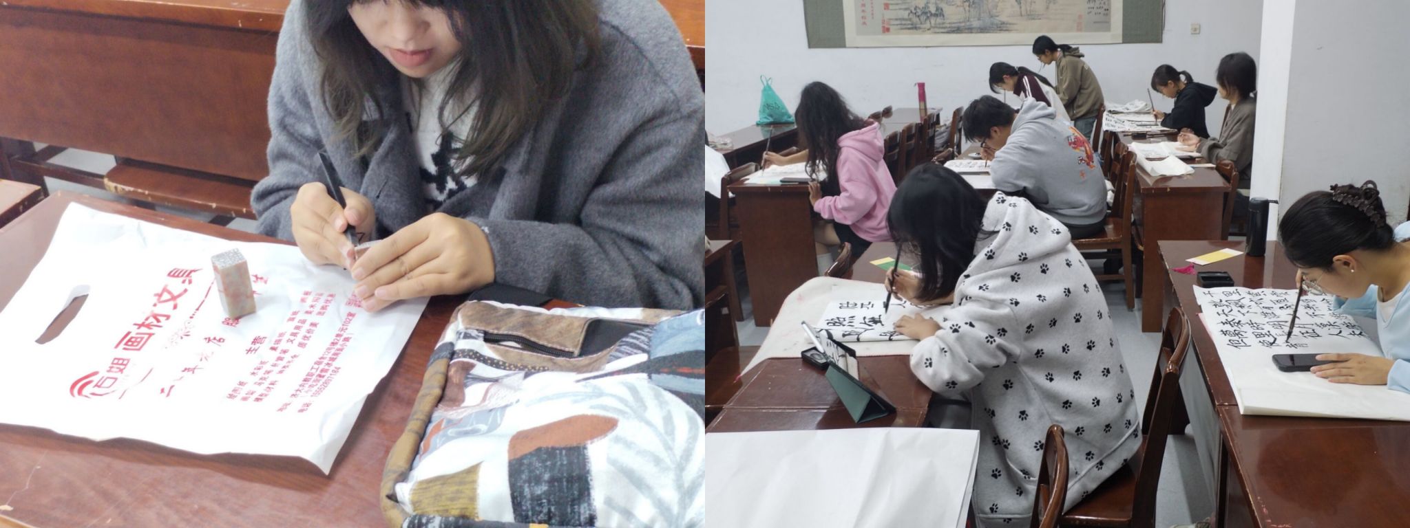 活动现场,氛围热烈而有序。社团成员们带着对艺术的憧憬与敬仰,齐聚一堂,共同探索金石书画的奥秘。活动开始,大家纷纷拿起手中的工具,有的专注于印章印面的设计,精雕细琢,展现出独特的艺术风格;有的则临摹碑帖,一笔一划间流露出对传统文化的深厚情感。